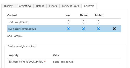 Add the “data8_companyid” column onto your form. Once added, double click it and select “Controls” from the top tabs and select the “Data8 BusinessInsights Lookup” control. When you have finished, save and publish the changes to your form.